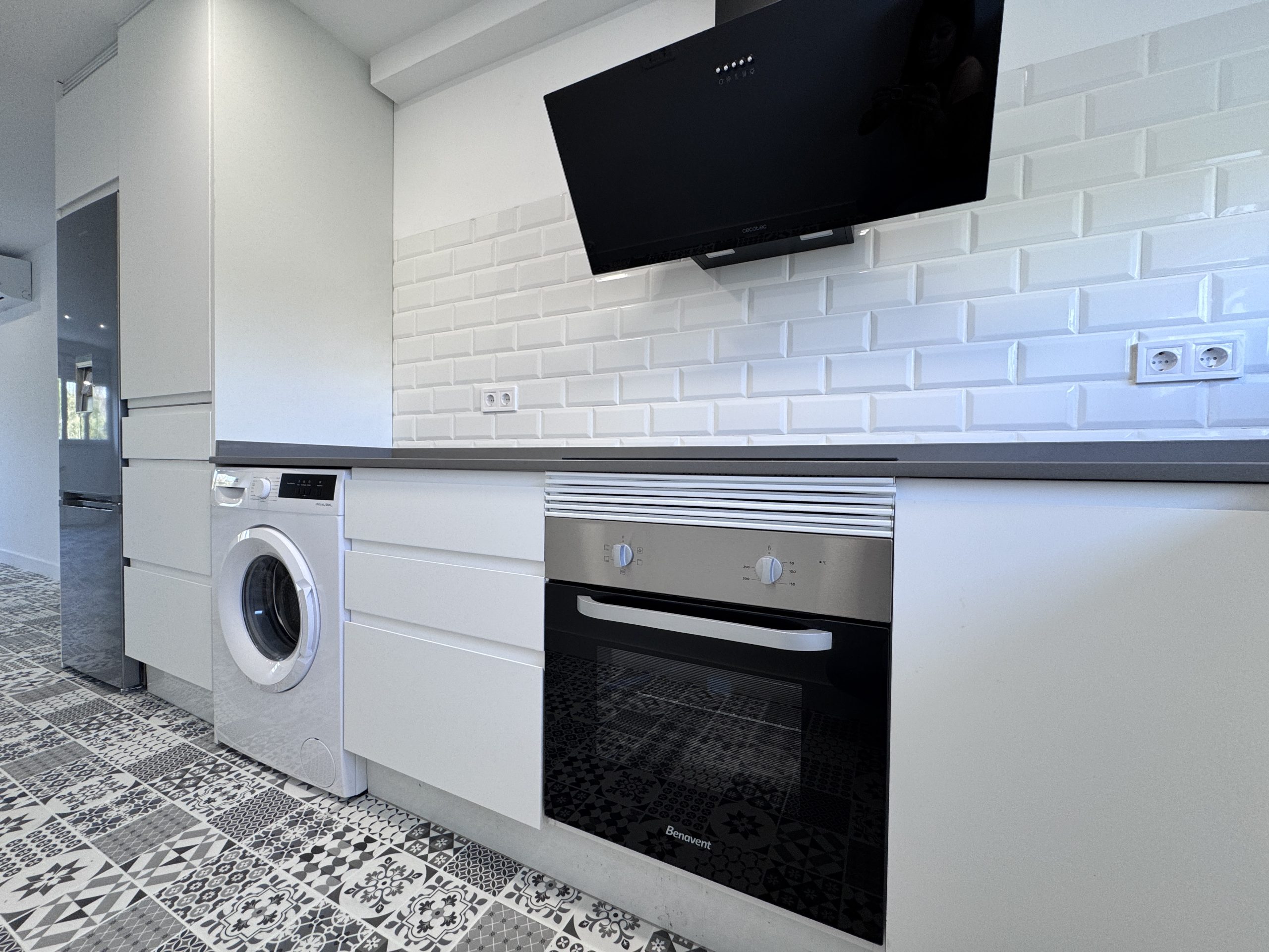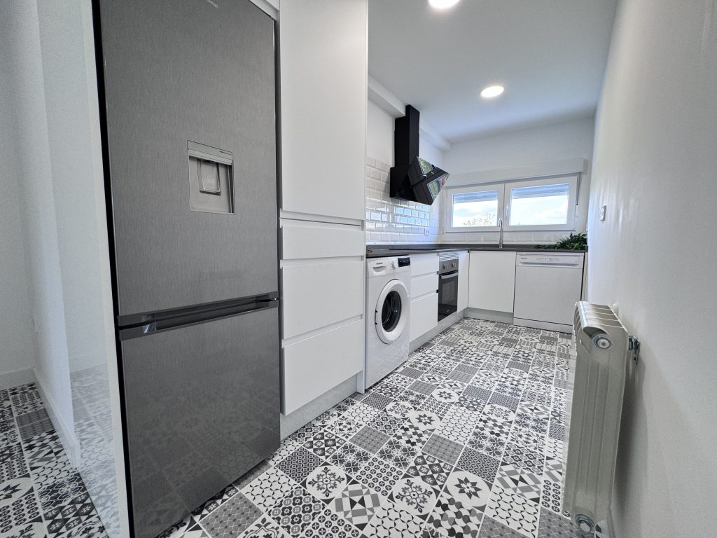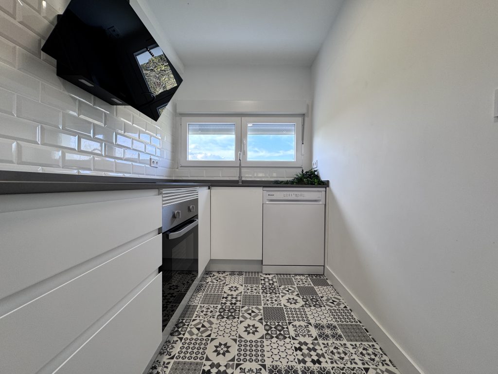 Se realiza la reforma completa de alicatado en la cocina con el mismo modelo que el baรฑo y se instala todo el mobiliariocon mรณdulos en color blanco lacado mate con uรฑero y encimera de cuarzo gris.