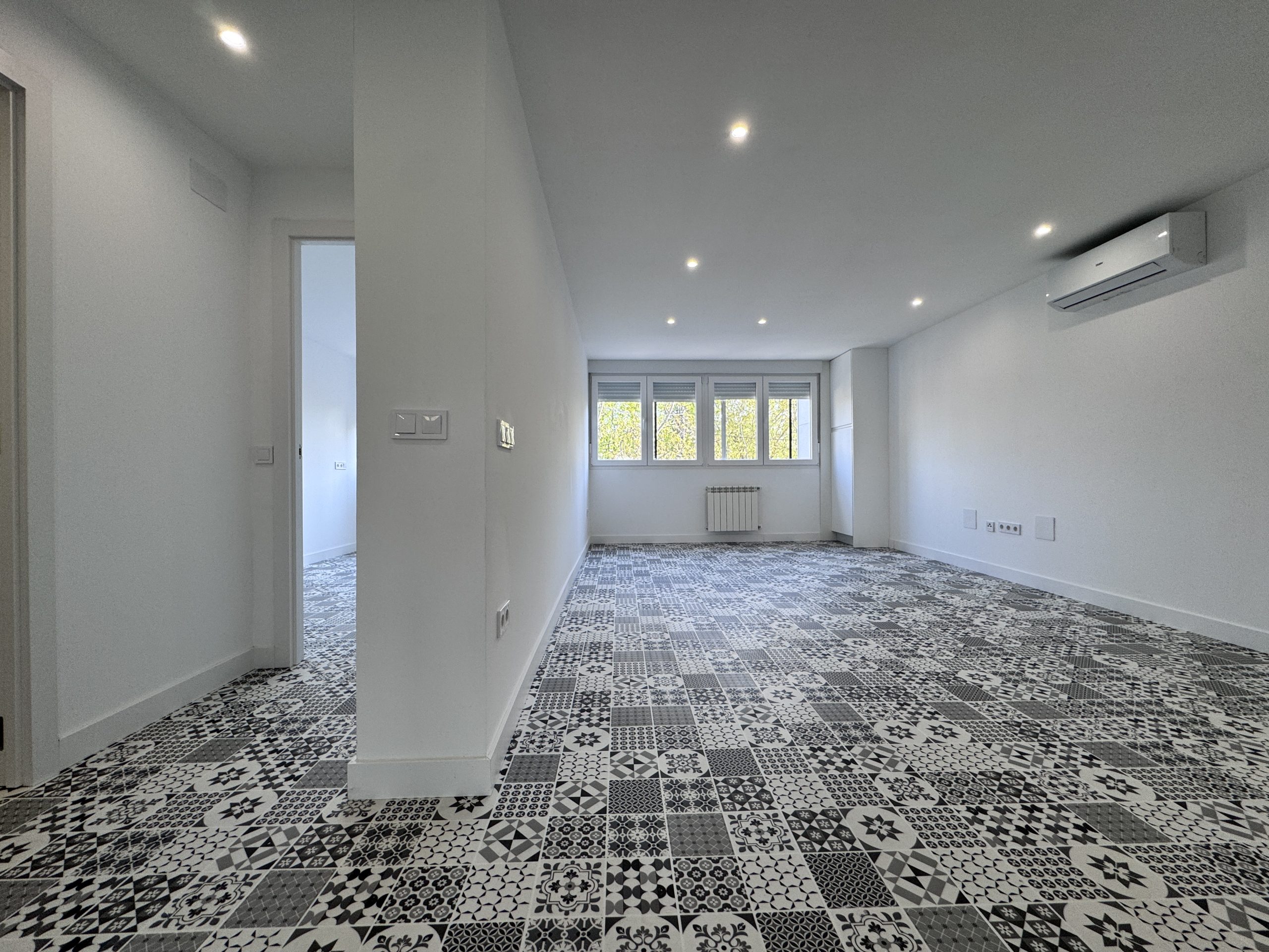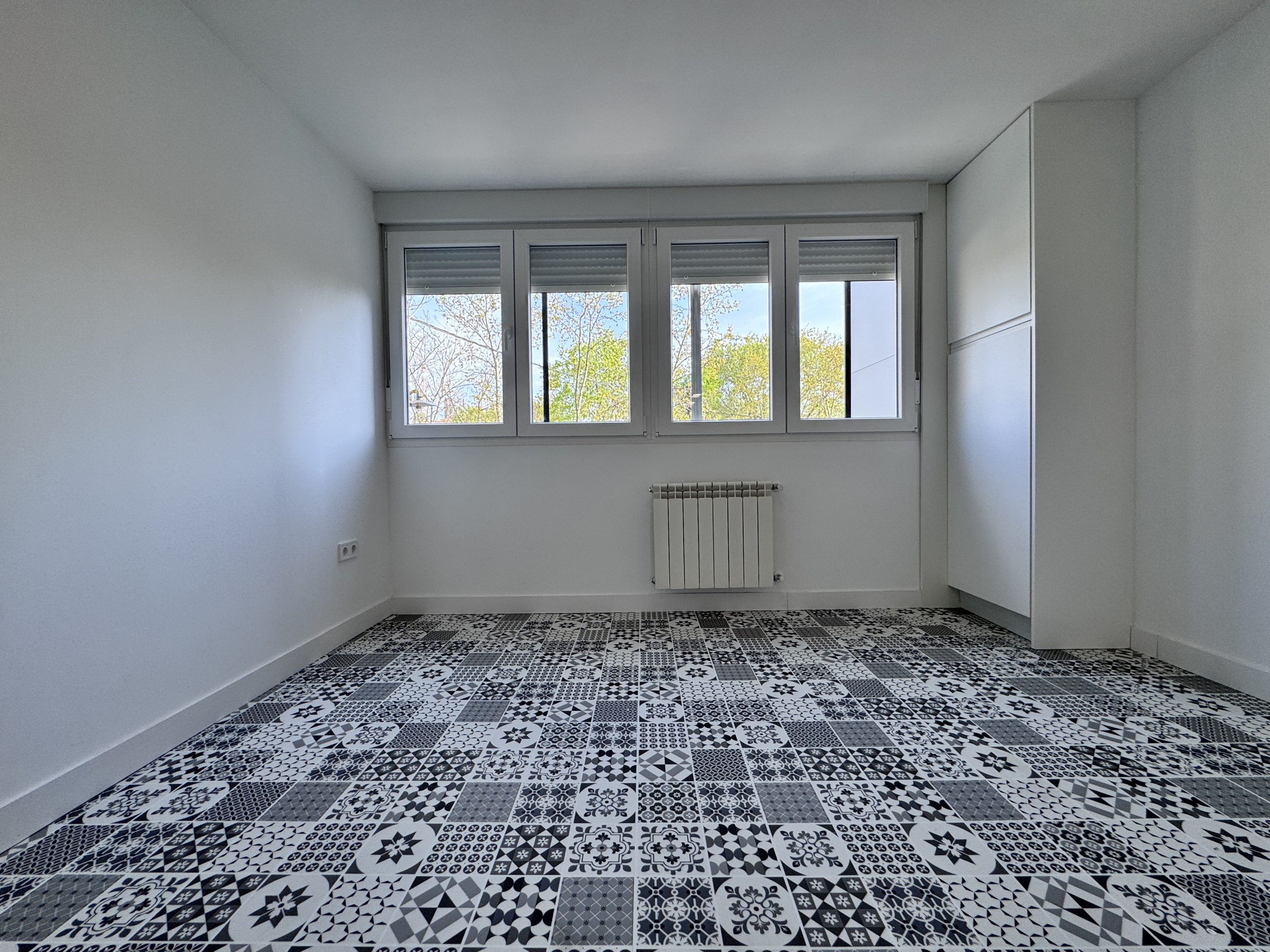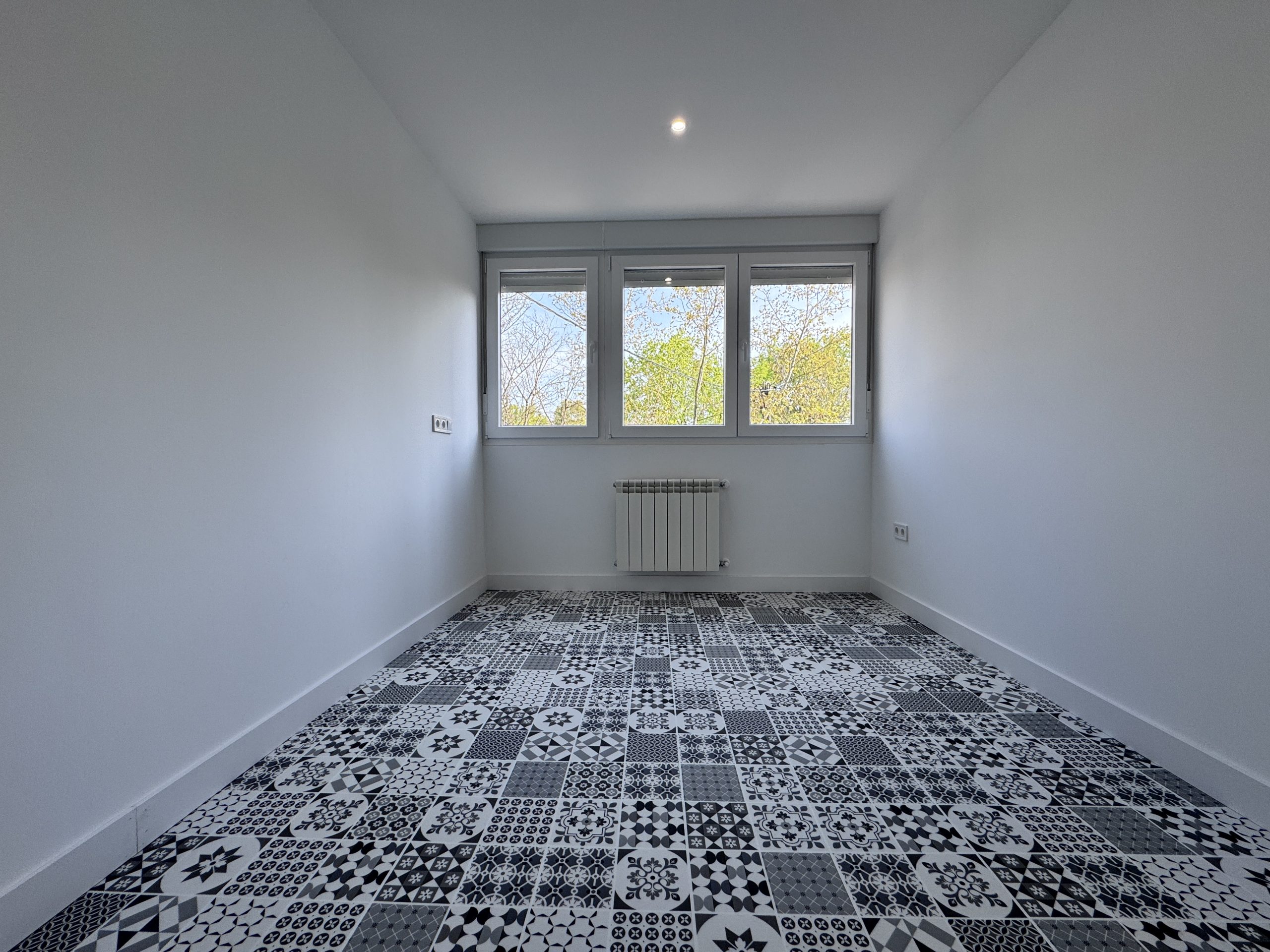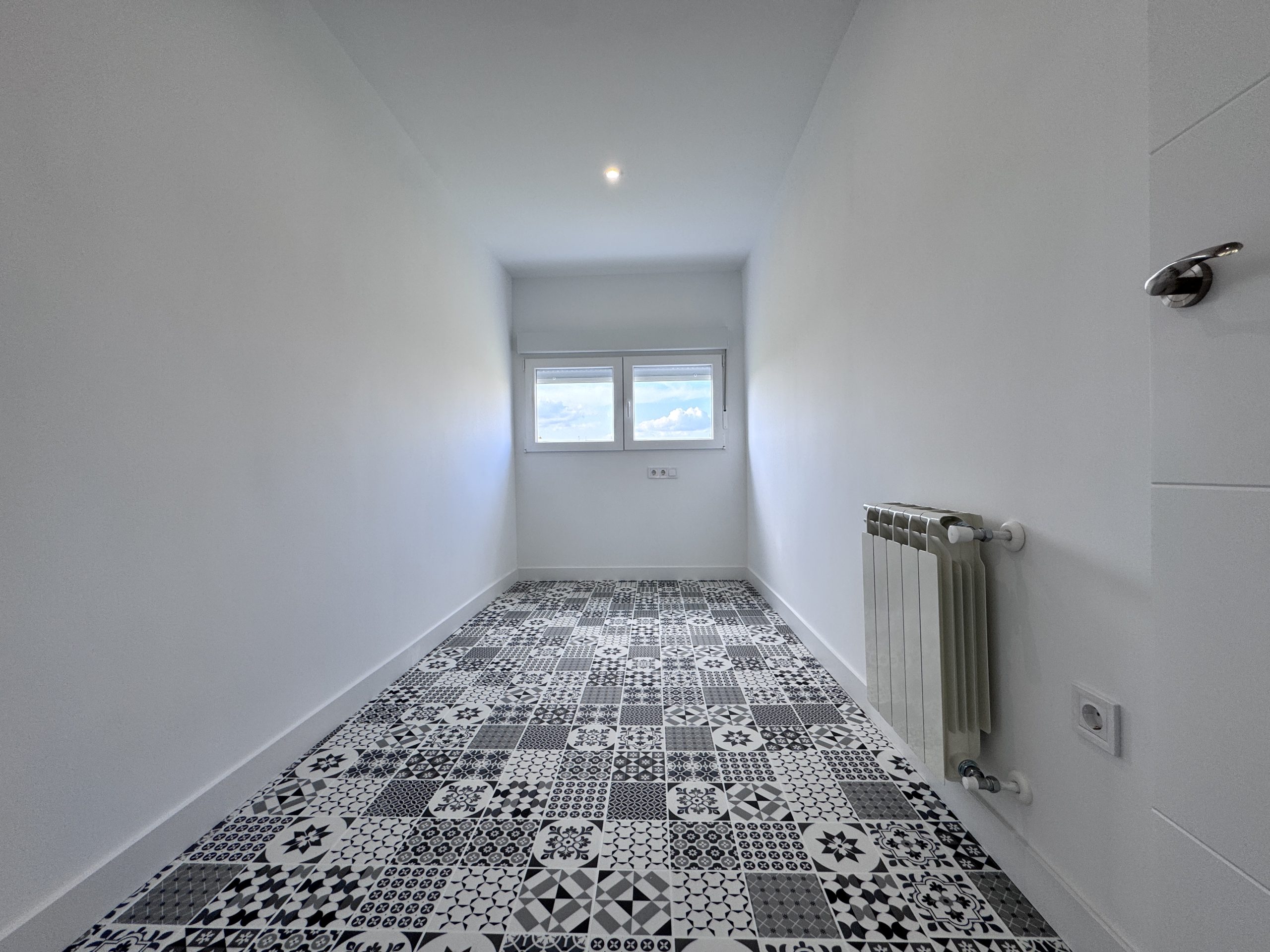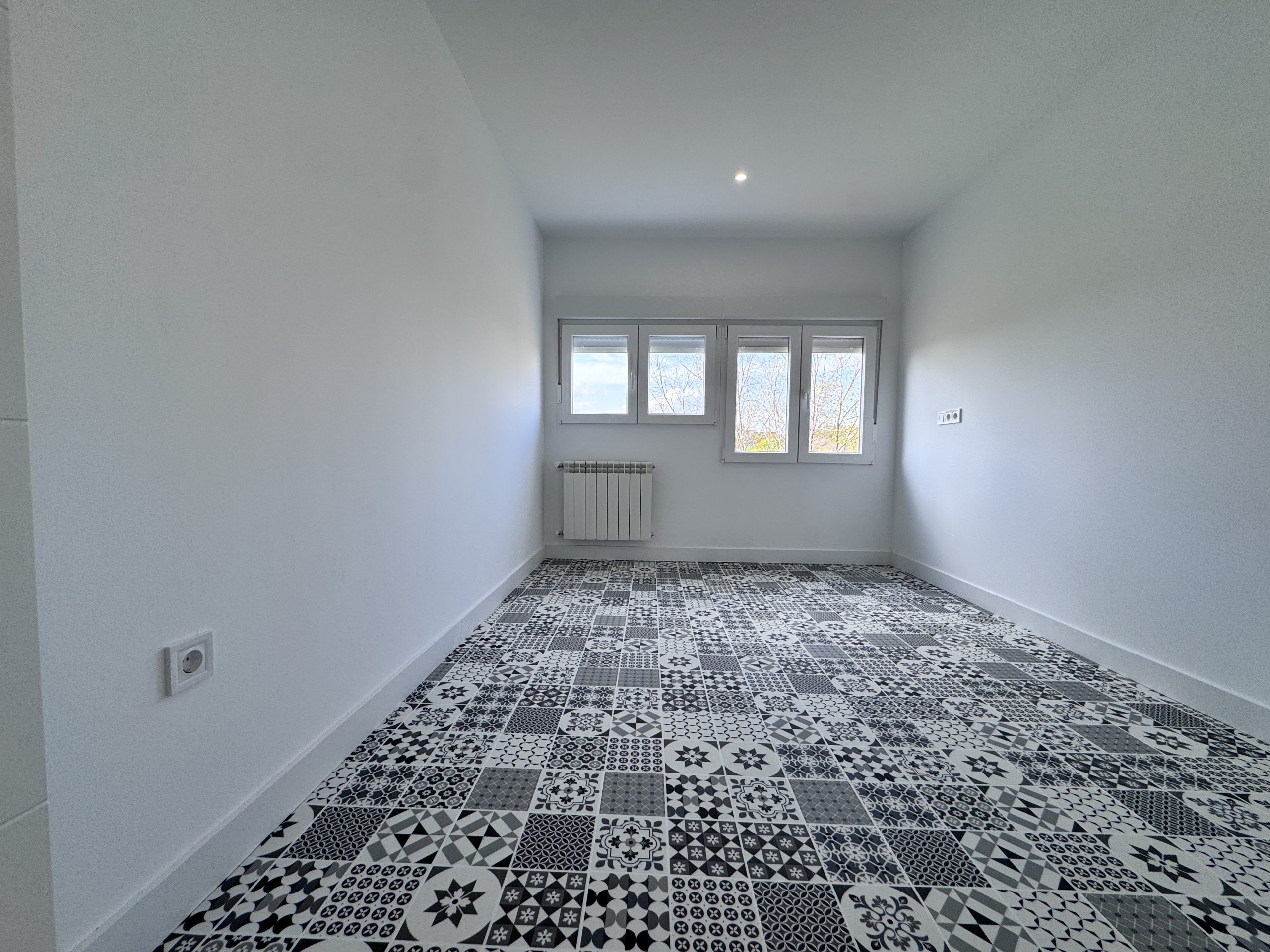 La carpinteria exterior se cambia completamente ampliando los huecos de las ventanas existentes en las habitaciones por unas de mayor altura e instalando un muro con aislamiento en el salรณn. Se instalan unas ventanas de PVC blanco marca Cortizo con vidrio Climalit 4/16/4 con persianas incorporadas.