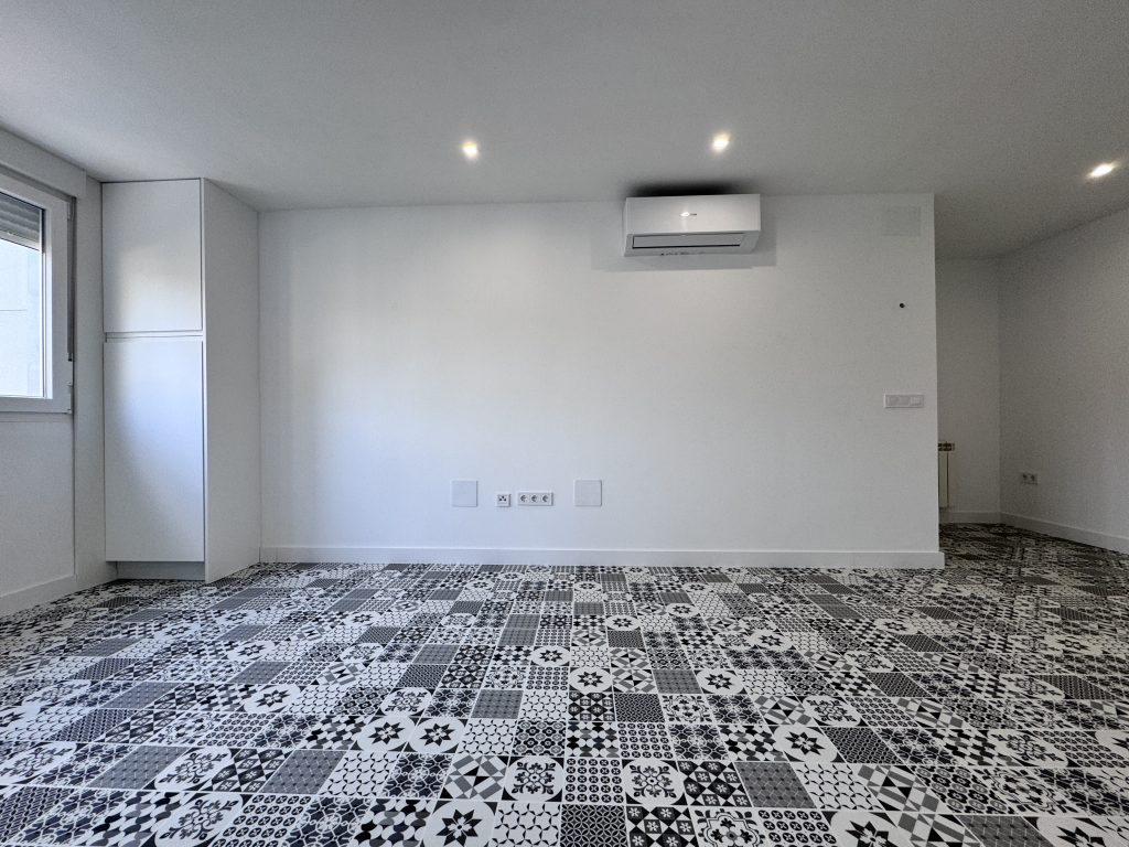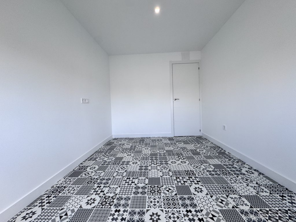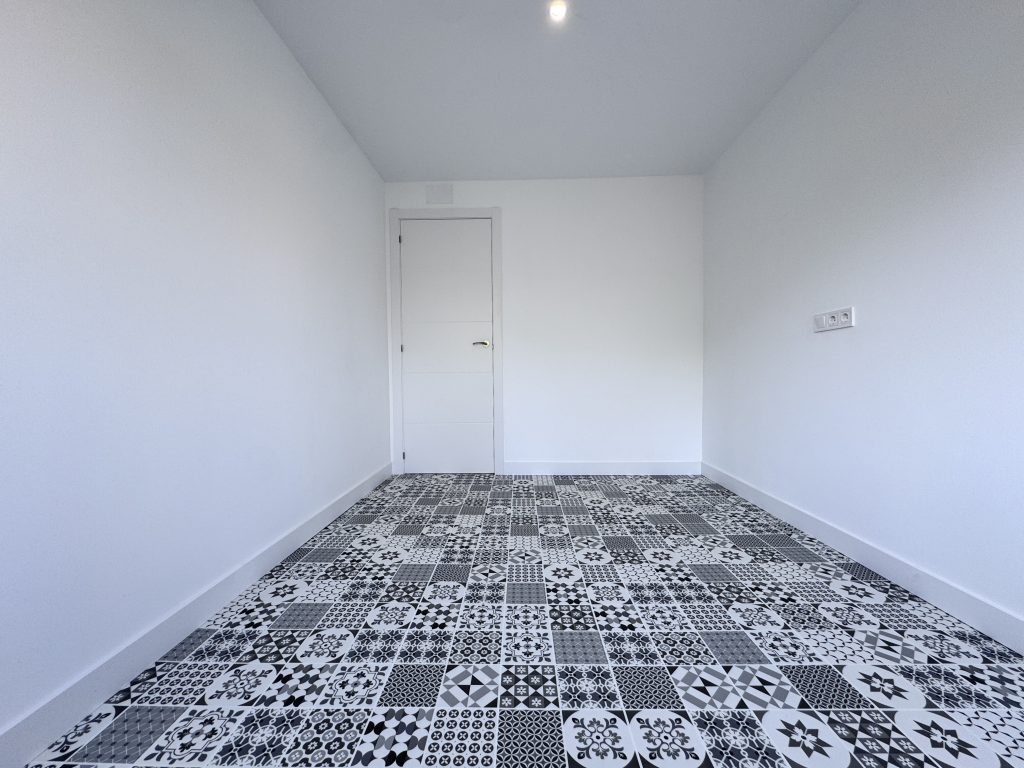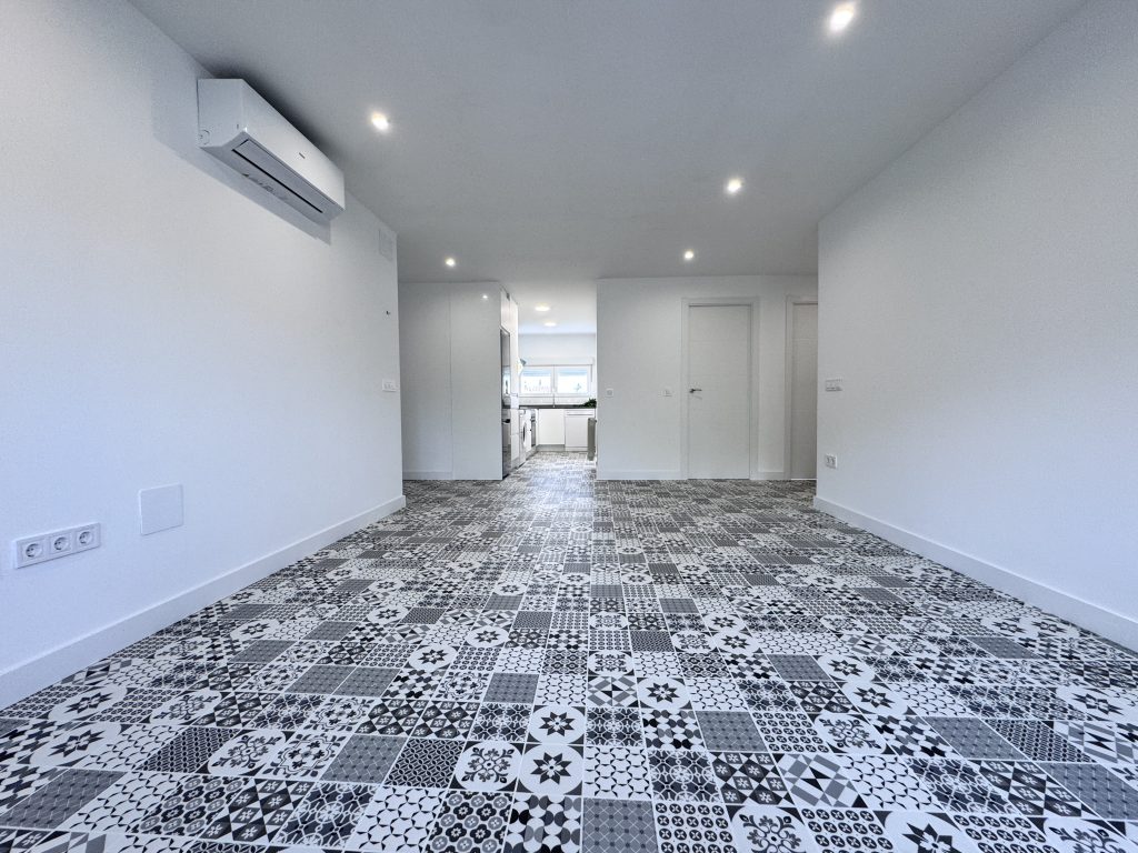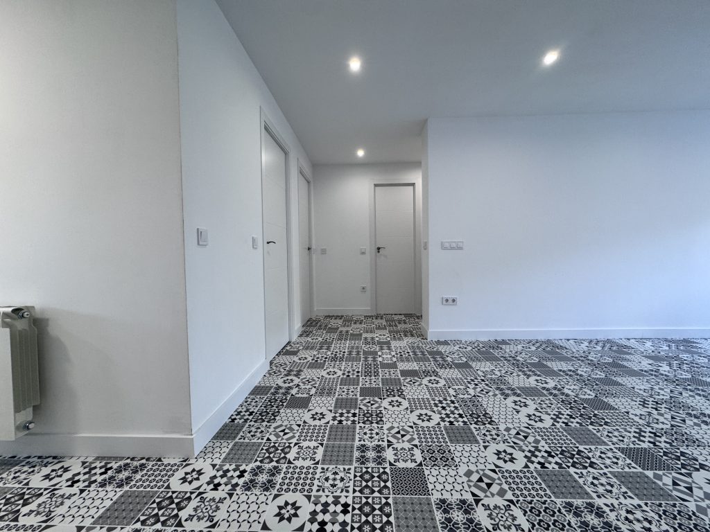 El suelo de la vivienda ha tenido que ser retirado y vaciado porque el antiguo solado estaba instalado sobre arena. Por lo que se ha vertido una nueva solera de hormigรณn para instalar un nuevo suelo de vinilo rรญgido en click efecto mosaico en toda la vivienda incluidos baรฑo y cocina.