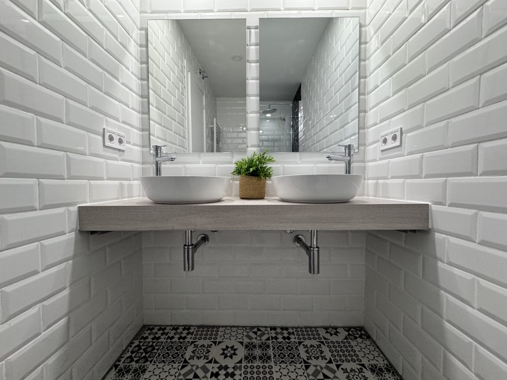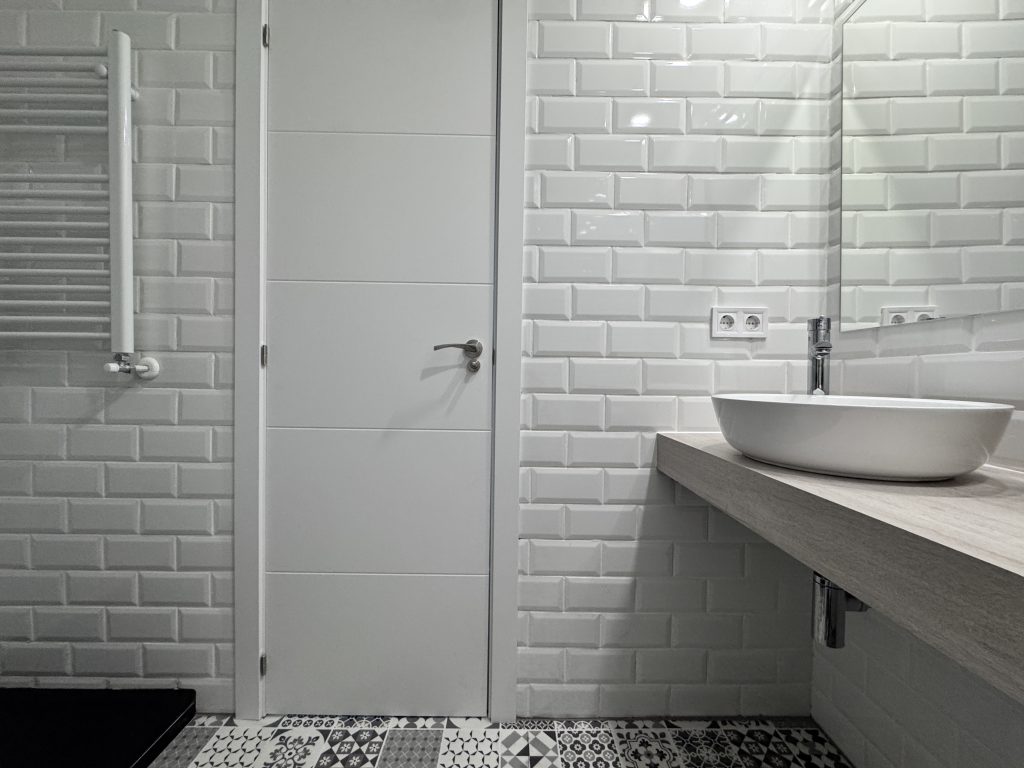 En el baรฑo se cambia completamente con equipos sanitarios nuevos y alicatado modelo metro en colores negro brillo y blanco brillo.