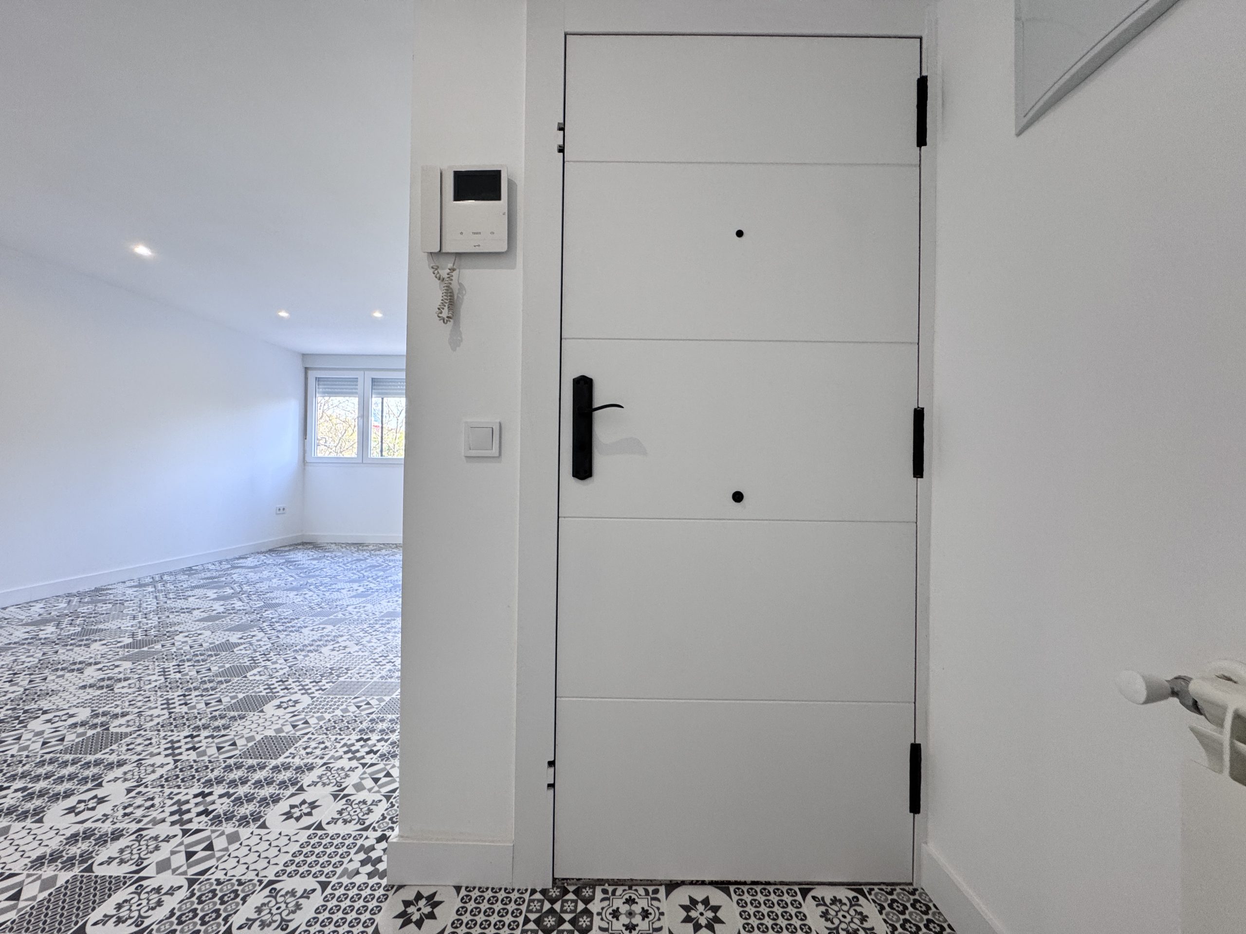 La carpinterรญa de madera de toda la vivienda se sustituye por nuevas puertas macizas abatibles en habitaciones en color blanco modelo pisco de gorriรณn y tiradores en color aluminio.